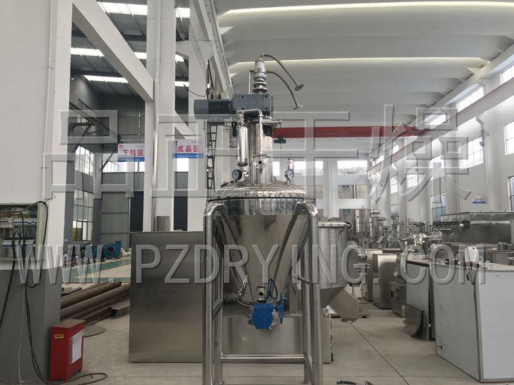 The heating cone is equipped with a heating jacket, and the heat source is hot water, heat transfer oil or low pressure steam, so that the inner wall of the cone can maintain a certain heating temperature. During operation, under the action of vacuum pump, certain vacuum conditions are maintained in the machine. The drive system drives the spiral belt mixing device to rotate (heating can be set at the same time), and the material under the action of mixing constantly turns inside the equipment, and fully contacts with the inner wall of the cone to realize heat transfer, so that the water inside the material is continuously evaporated, and the water vapor is led out by the vacuum pump and collected by the condenser. After drying, open the lower discharge valve to discharge.